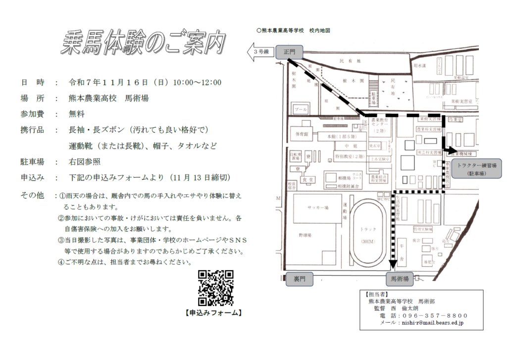 乗馬体験のご案内 2025 11/09 December 24, 2025 目次乗馬体験を開催いたします! 乗馬体験案内チラシダウンロード 申込はこちらから(フォームが開きます) たくさんのご来場、お待ちしてます🏇 お知らせ よかったらシェアしてね! URLをコピーしました! 2025年度 クラブ会員募集